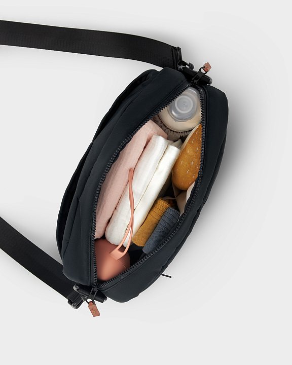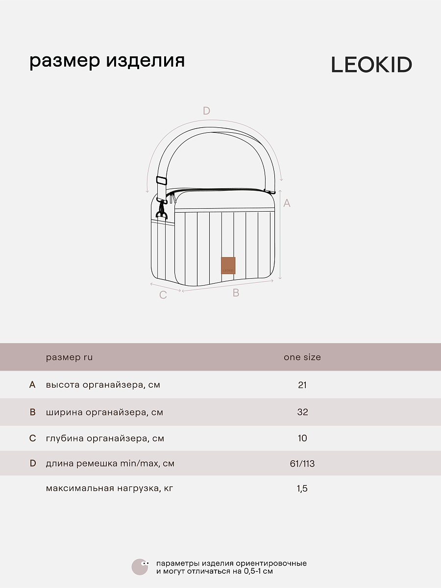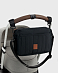 Аксессуар выполнен из прочной ткани с водоотталкивающей пропиткой и легко крепится на ручке коляски одним из трех способов: с помощью липучек, карабинов или основного ремешка. Его также можно носить в руках или на плече.