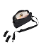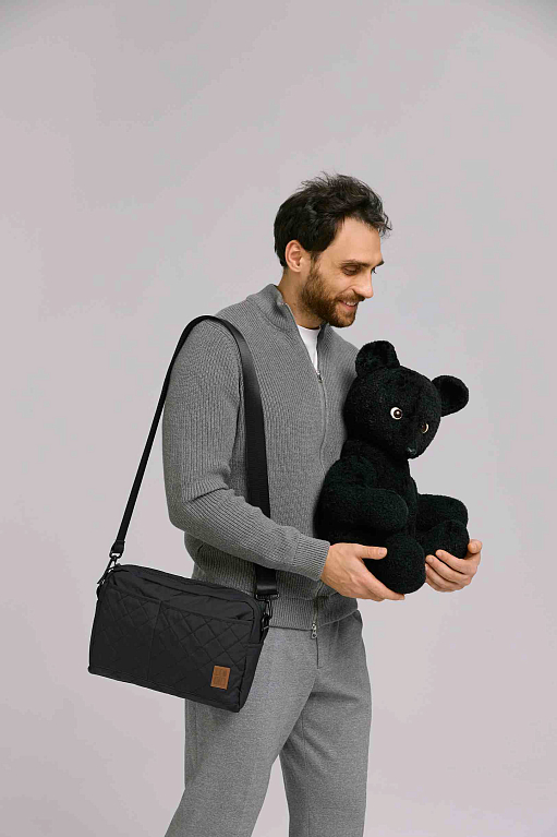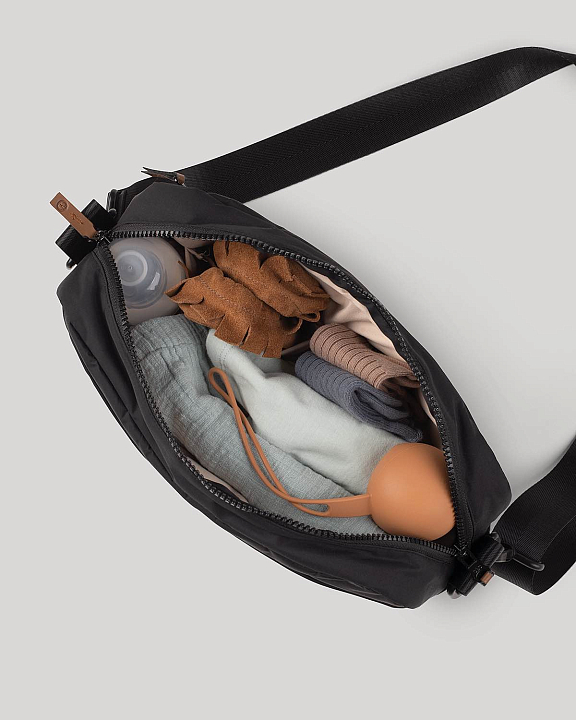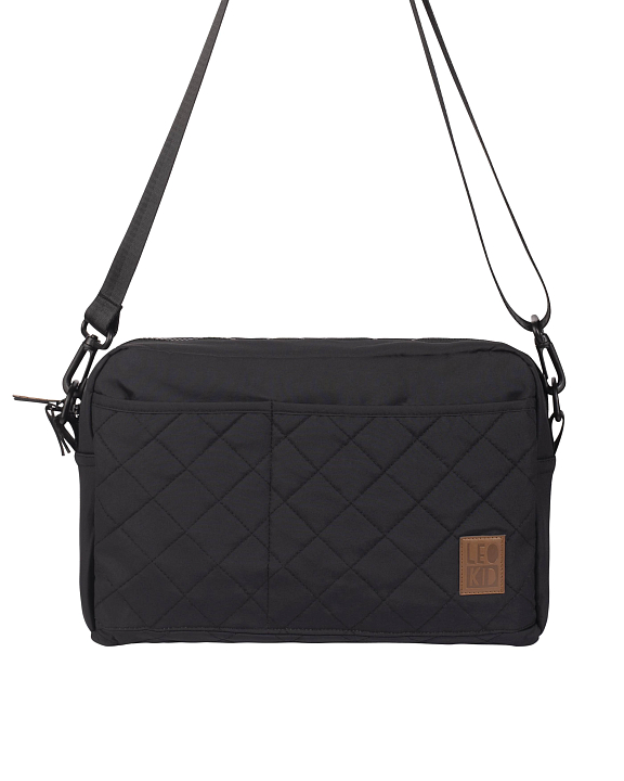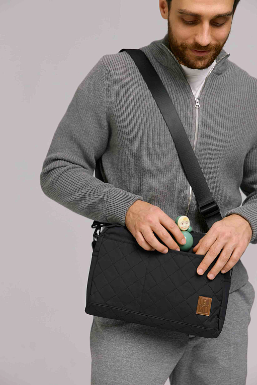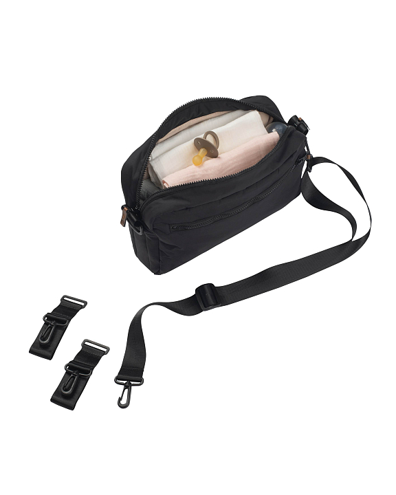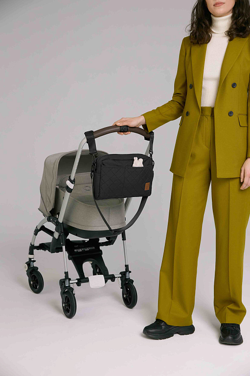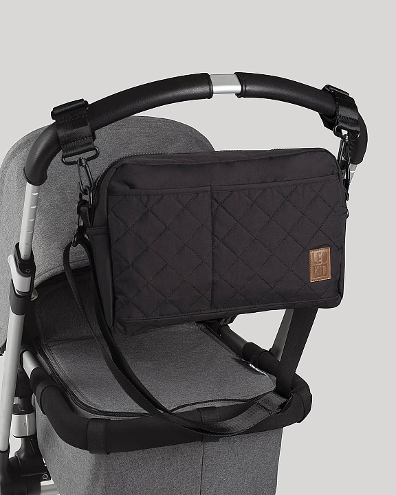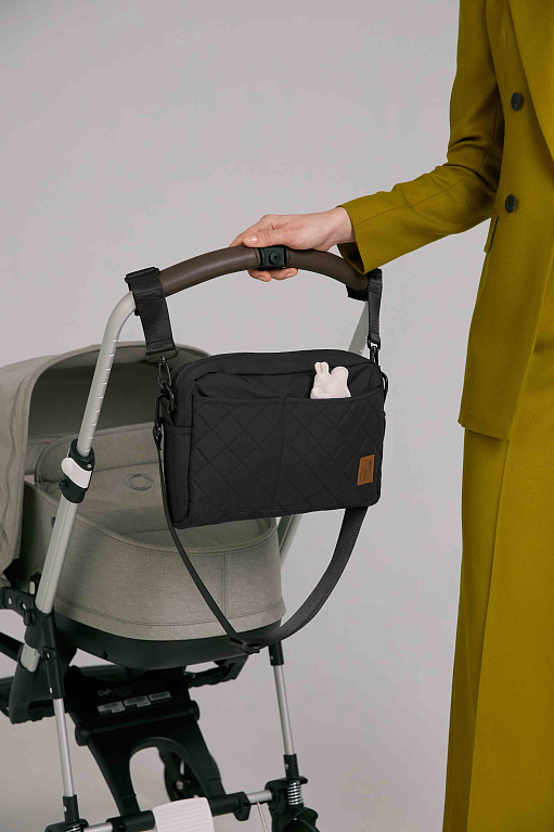 Аксессуар выполнен из прочной ткани с водоотталкивающей пропиткой и легко крепится на ручке коляски одним из трех способов: с помощью липучек, карабинов или основного ремешка. Его также можно носить в руках или на плече.