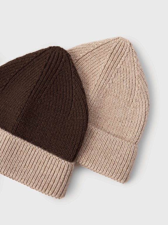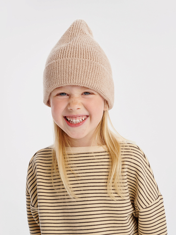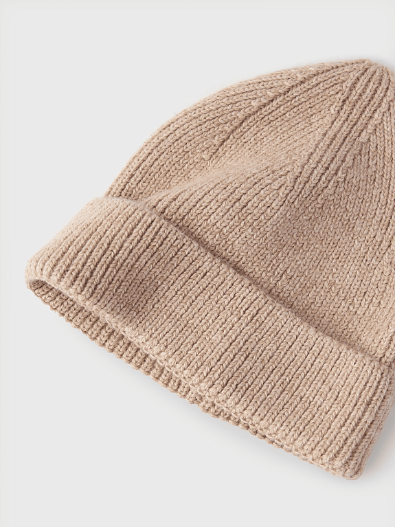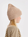Вязаная шапка актуальной формы «бини», утепленная достаточным количеством шерсти, приятная на ощупь и удобная в носке.