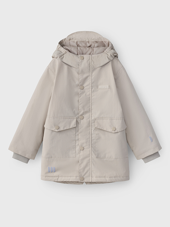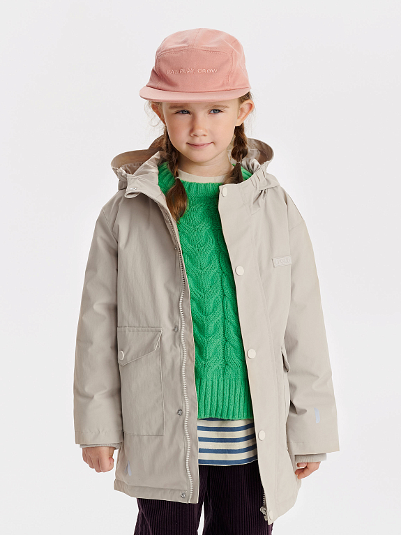 Имеет слегка удлиненный силуэт, ткань с водоотталкивающей пропиткой, легкий утеплитель 80 г/м², накладные карманы, ветрозащитную планку, защиту от защемления подбородка и светоотражающие элементы для безопасности в темное время суток.