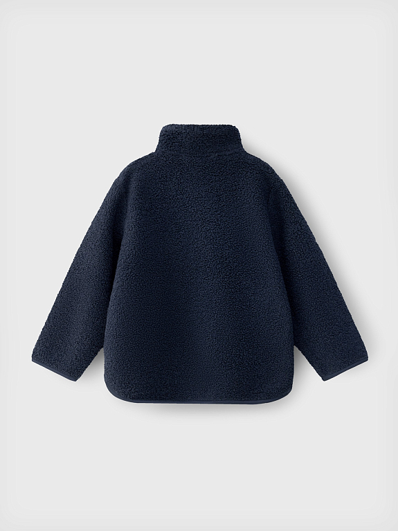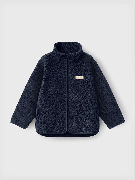 Имеются мягкие накладные карманы для детских ручек и воротник-стойка, защищающий горло от ветра.