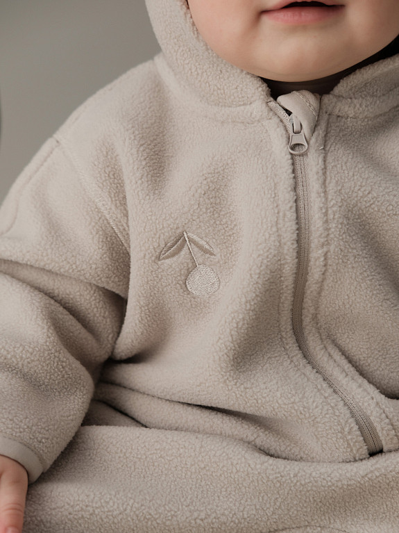 Комбинезон, созданный из инновационной бондированной ткани, представляющей собой двухслойный сэндвич: уютный флис снаружи, нежный хлопок внутри. Модель идеально подойдет для выписки из роддома, первых прогулок с малышом и в качестве подарка новоиспеченным родителям. Материал не только мягкий, но и прочный — он отлично держит форму и не боится многочисленных стирок. Его очень удобно использовать — длинная молния позволяет легко снять изделие, не разбудив малыша. А милая вышивка с вишенками — та самая деталь, в которую влюбляются с первого взгляда.